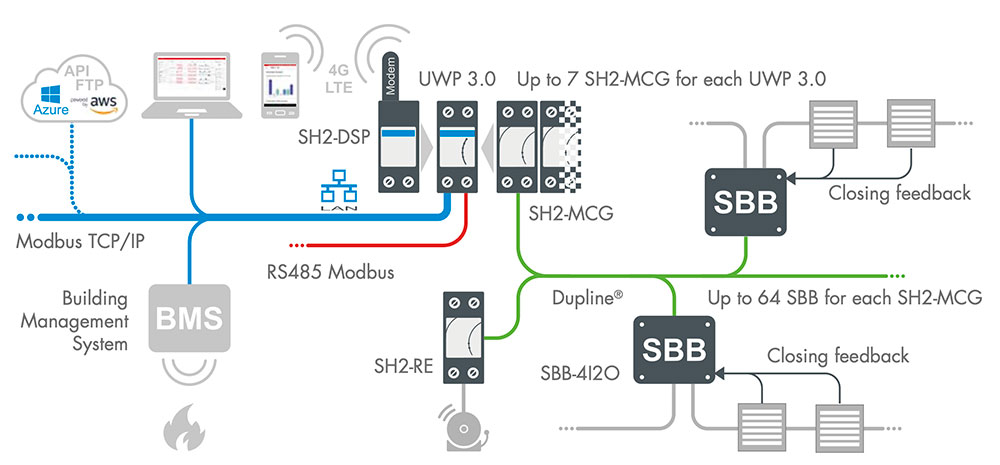 Systemet har en modulær oppbygging. For å opprette et Smart Dupline® nettverk plugges ganske enkelt en bussgenerator (SH2-MCG24) sammen med UWP-controlleren (UWP30RSEXXXX). Inntil 7 bussgeneratorer kan kobles til èn controller, og danner da 7 Smart Dupline® nettverk. Ved å benytte flere controllere kan systemet oppskaleres ytterligere.