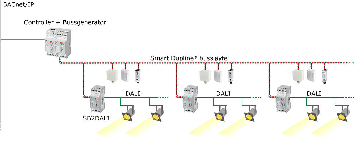 Hver enkelt controller (UWP30RSExx eller SB2WEB24) kan tilkobles inntil 7 Smart Dupline nettverk. Hvert av disse nettverkene/bussløyfene drives av bussgeneratoren SH2MCG24. For DALI lysstyring benyttes SB2DALIxx som gateway. Hver enkelt gateway kan videre håndtere inntil 64 DALI ballaster fordelt på 16 soner.