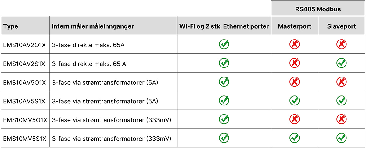 - 1 stk. RS485 Modbus slave port (utførelser for direkte måling)
