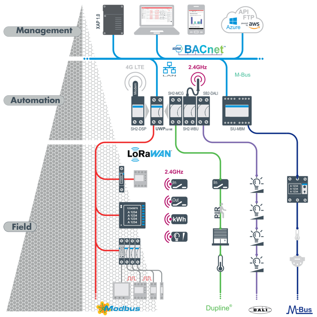UWP30 er en kraftig og fleksibel web-basert controller som kombinerer energiovervåking og bygningsautomatisering i én enhet. Plattformen er skalerbar fra å kunne håndtere alt fra én energimåler og opp til flere hundre målepunkter. UWP30 fungerer som en gateway mellom ulike kommunikasjonsprotokoller, og kan også overføre informasjon til PLS og andre typer overordnede systemer. Den støtter protokoller som BACnet/IP, Modbus TCP/IP, REST-API og MQTT – med integrasjon mot Microsoft Azure og AWS. I tillegg støttes DALI-protokoll for lysstyring. UWP30 sørger for sømløs integrasjon med våre energimålere og nettanalysatorer, og gir full oversikt over forbruk i sanntid, med trender, historikk og varsler.