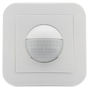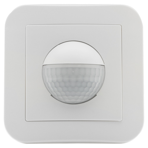 Bevegelsesdetektor for veggmontasje. Detektoren har relè og akustisk sensor som kan forlenge utløpstiden ved lyd. Elnummer: 1405226