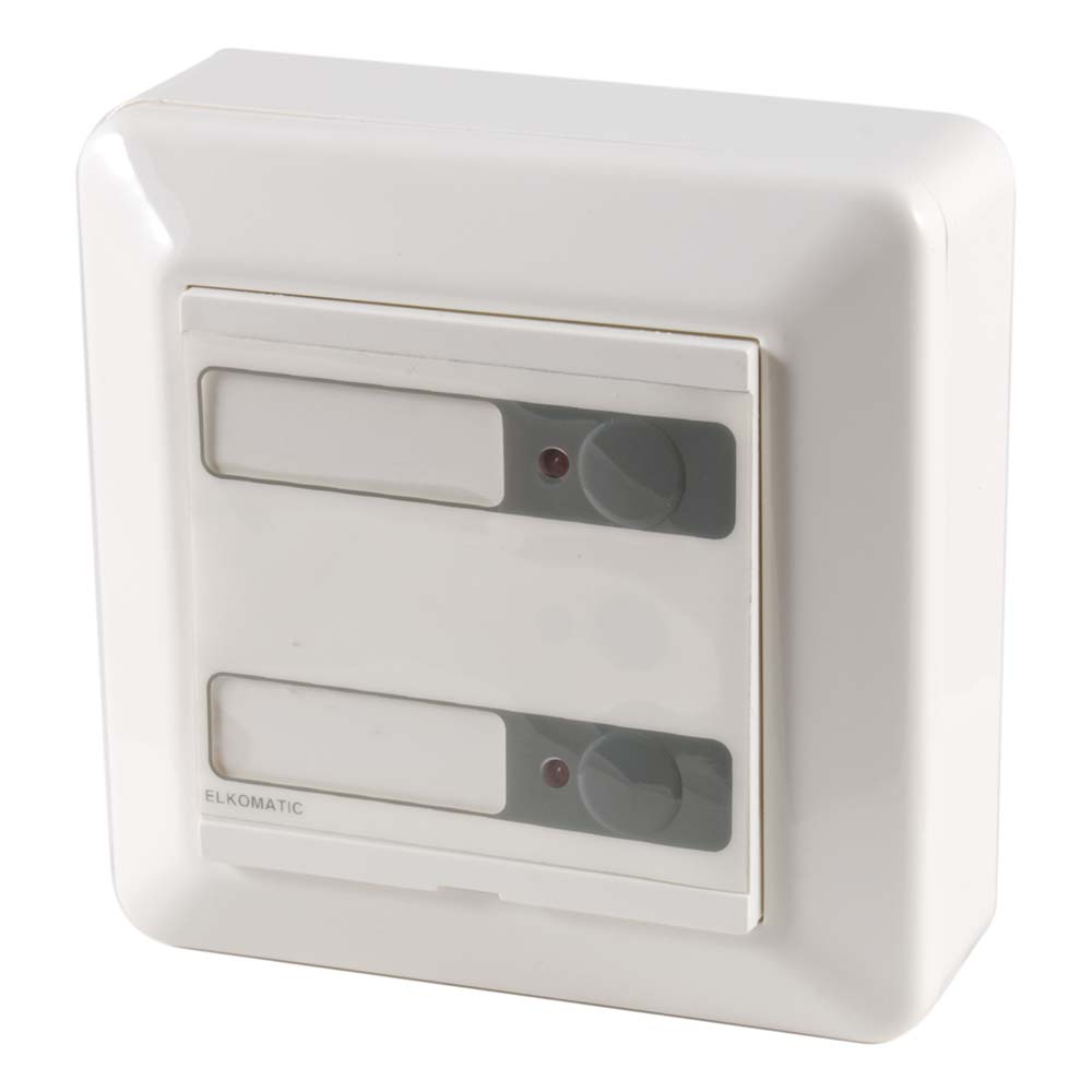 2-kanals bryter. Hvit. 55×55 mm. For veggmontering. Forsyningsspenning: Bussforsynt. Med 2 trykknapper og 2 LED. Elko RS design.