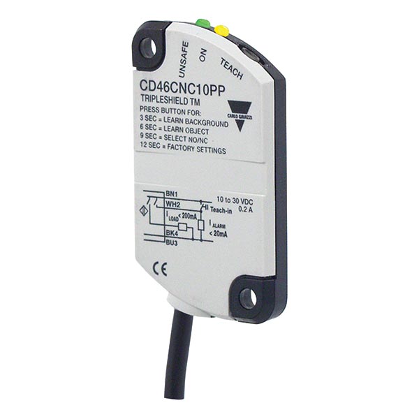 Rektangulær og flat kapasitiv giver i kunststoff. Skjermet utførelse med føleavstand inntil 10mm (teach-funksjon). Sensoren har PNP utgang med valgbar funksjon NO/NC. Med alarmutgang. Leveres med 2 meter kabel. Giveren er beregnet for forsyningsspenning 10-40 VDC.