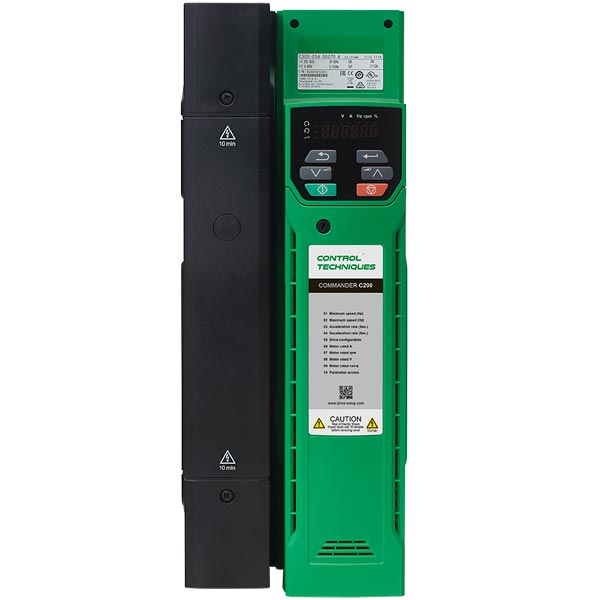 Frekvensomformer Commander C200-serie er enkel å installere (DIN-skinne feste opp til 1,5kW). Den er brukervennlig med preget parameterinnstillinger i front og forhåndslagret oppsett. Commander C200 er robust og ideell for et bredt spekter av motorstyrings applikasjoner for åpen loop. Eksempelvis vifter, pumper, kompressorer, transportbånd og miksere. Commander C200 for 230VAC fåes i størrelsene 0,25kW – 75kW. Commander C200 for 400VAC fåes i størrelsene 0,37kW – 132kW. Beskyttelsesgrad IP20. Fabrikat: Control Techniques. (Control Techniques var tidligere eid av Emerson, men er kjøpt opp av Nidec-gruppen).
