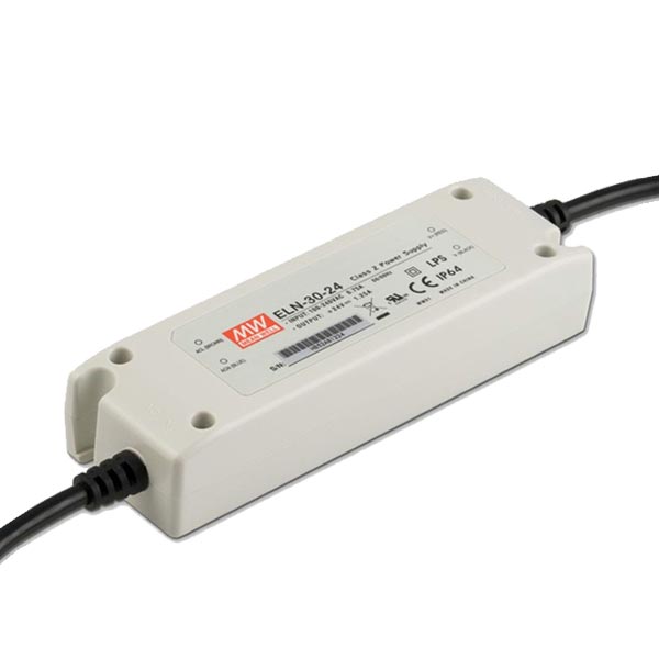 Strømforsyning for 1-fas 90-264 VAC. For LED. Sekundærspenning 24 VDC. Effekt inntil 30 W. For Panelmontasje. Fast kabel. Kapslet utførelse.
