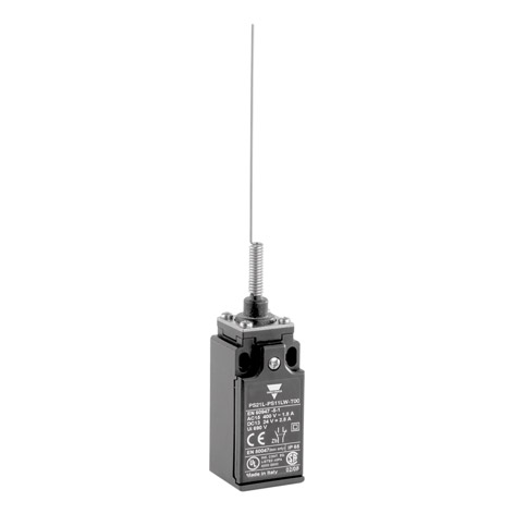 Endebryter i utførelse PS30mm med thermoplast hus og thermoplast hode. Endebryteren har 1NO+1NC rask utgang. PG13.5 kabelinnføring. Fjærbelastet pisk.