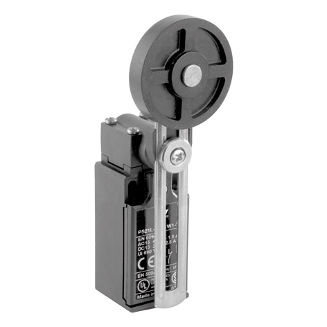 Endebryter PS30mm. Thermoplast hus. Thermoplast hode. 1NO+1NC rask utgang. Justerbar arm og justerbar gummirulle.