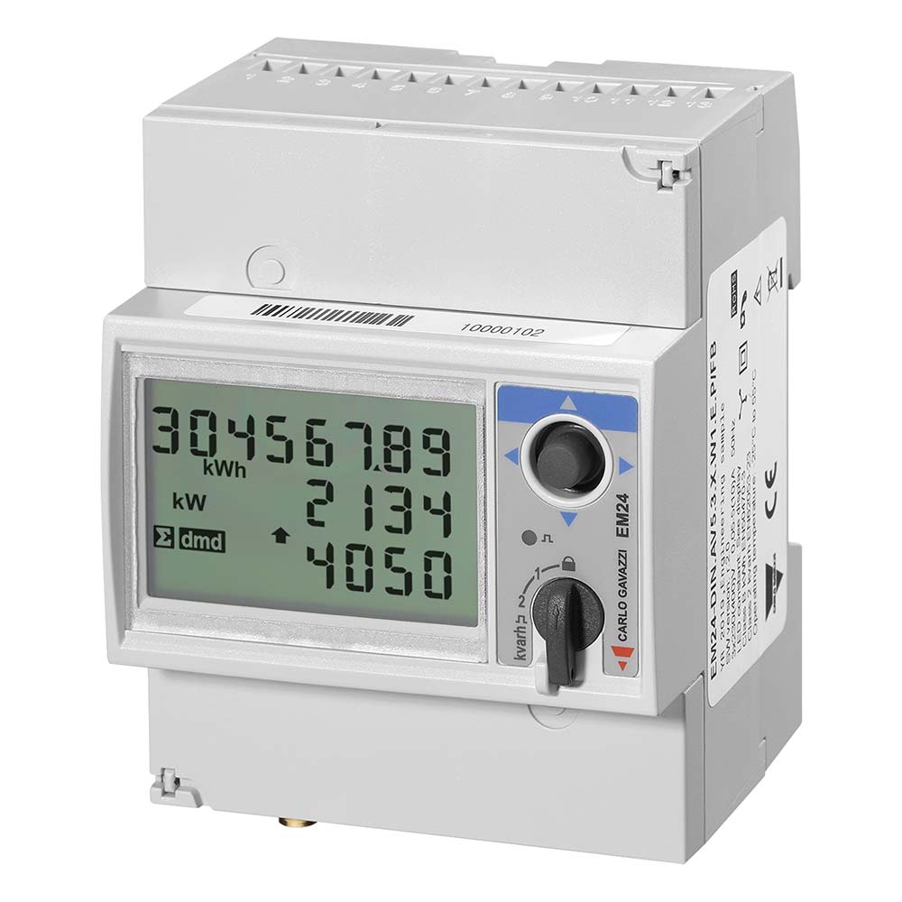 EM24DINAV93XISX Energimåler/kWh-måler. 3-fase direkte måler 400VAC, maks. last 65AAC. Med RS485 Modbus grensesnitt. Tilgang til alle relevante elektriske verdier som A, V, W, VAr, VArh, cos. phi. osv. Modulærutførelse med byggebredde 4-moduler.