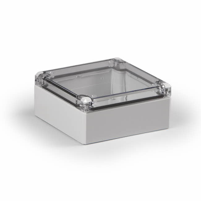 Ensto Cubo D kapsling i Polykarbonat med glatte sider. Grå underdel og transparent deksel. 120x122x56. Beskyttelsesgrad IP66. Slagfasthet IK08.