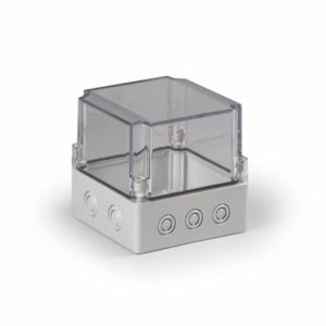 Ensto Cubo S kapsling i glassfiberarmert polykarbonat. Med PG knock-outs/utsparringer. Størrelse 125x125x125mm. Transparent deksel. Beskyttelsesgrad IP66. Slagfasthet IK08.