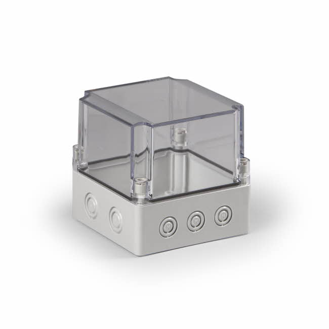 Ensto Cubo S kapsling i glassfiberarmert polykarbonat med PG knock-outs/utsparringer. Størrelse 125x125x125mm. Transparent deksel i polykarbonat. Beskyttelsesgrad IP66. Slagfasthet IK08. Kapslingene har spor i underdelen beregnet på kretskort, og skrufester for DIN-Skinne.