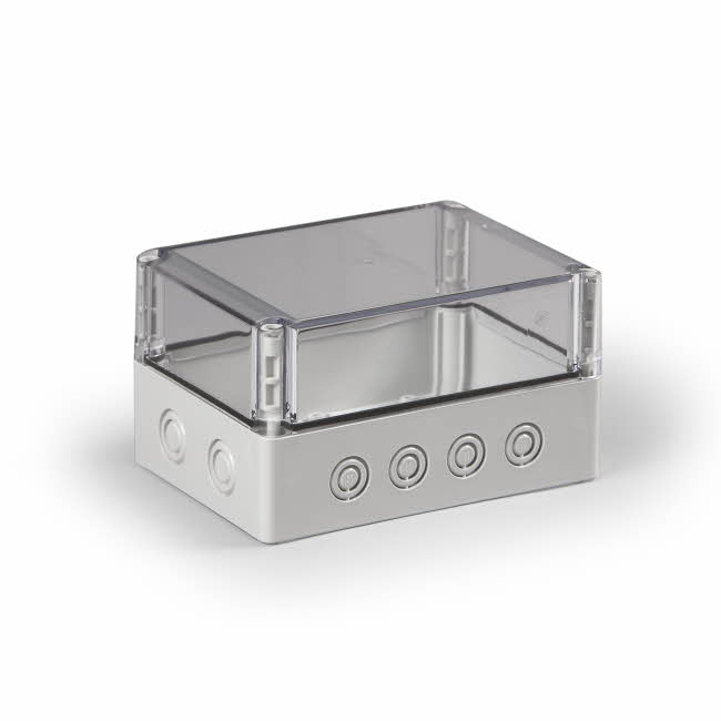 Ensto Cubo S kapsling i glassfiberarmert polykarbonat. Med PG knock-outs/utsparringer. Størrelse 125x175x100mm. Transparent deksel. Beskyttelsesgrad IP66. Slagfasthet IK08.