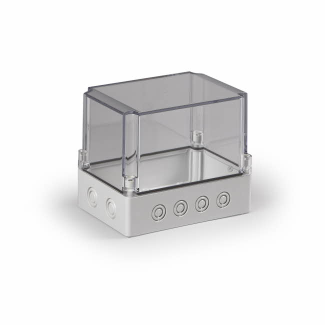 Ensto Cubo S kapsling i glassfiberarmert polykarbonat. Med PG knock-outs/utsparringer. Størrelse 130x180x150mm. Transparent deksel. Beskyttelsesgrad IP66. Slagfasthet IK08.