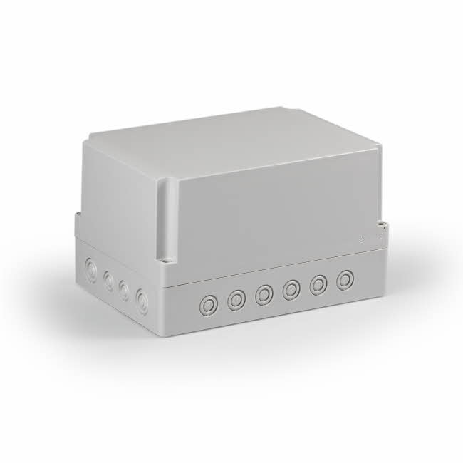 Ensto Cubo S kapsling i glassfiberarmert polykarbonat med metriske knock-outs/utsparringer. Størrelse 175x250x150mm. Grått deksel i polykarbonat. Beskyttelsesgrad IP66. Slagfasthet IK08. Kapslingene har spor i underdelen beregnet på kretskort, og skrufester for DIN-Skinne.
