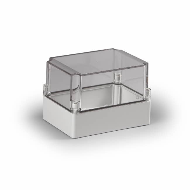 Ensto Cubo S kapsling i glassfiberarmert polykarbonat med glatte sider. Størrelse 125x175x125mm. Transparent deksel. Beskyttelsesgrad IP66. Slagfasthet IK08.