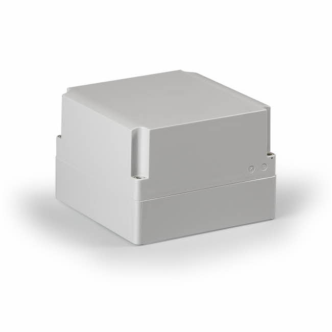 Ensto Cubo S kapsling i glassfiberarmert polykarbonat med glatte sider. Størrelse 175x175x125mm. Grått deksel. Beskyttelsesgrad IP66. Slagfasthet IK08.