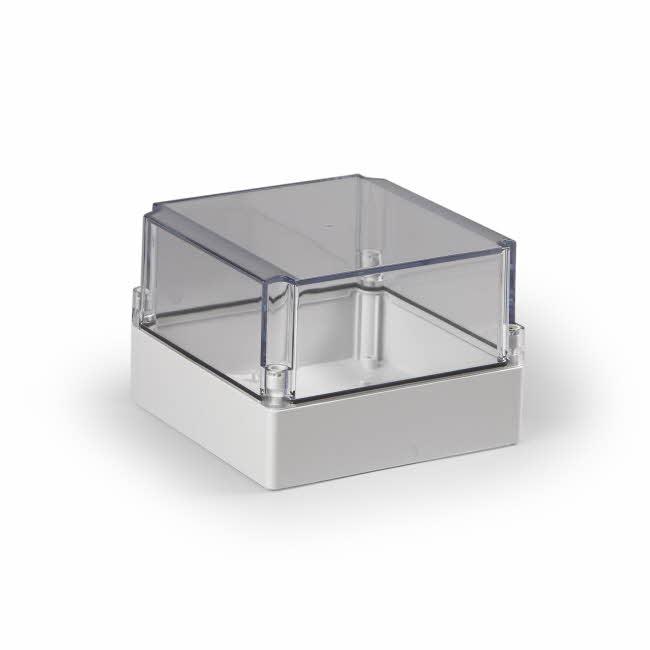 Ensto Cubo S kapsling i glassfiberarmert polykarbonat med glatte sider. Størrelse 175x175x125mm. Transparent deksel i polykarbonat. Beskyttelsesgrad IP66. Slagfasthet IK08. Kapslingene har spor i underdelen beregnet på kretskort, og skrufester for DIN-Skinne.