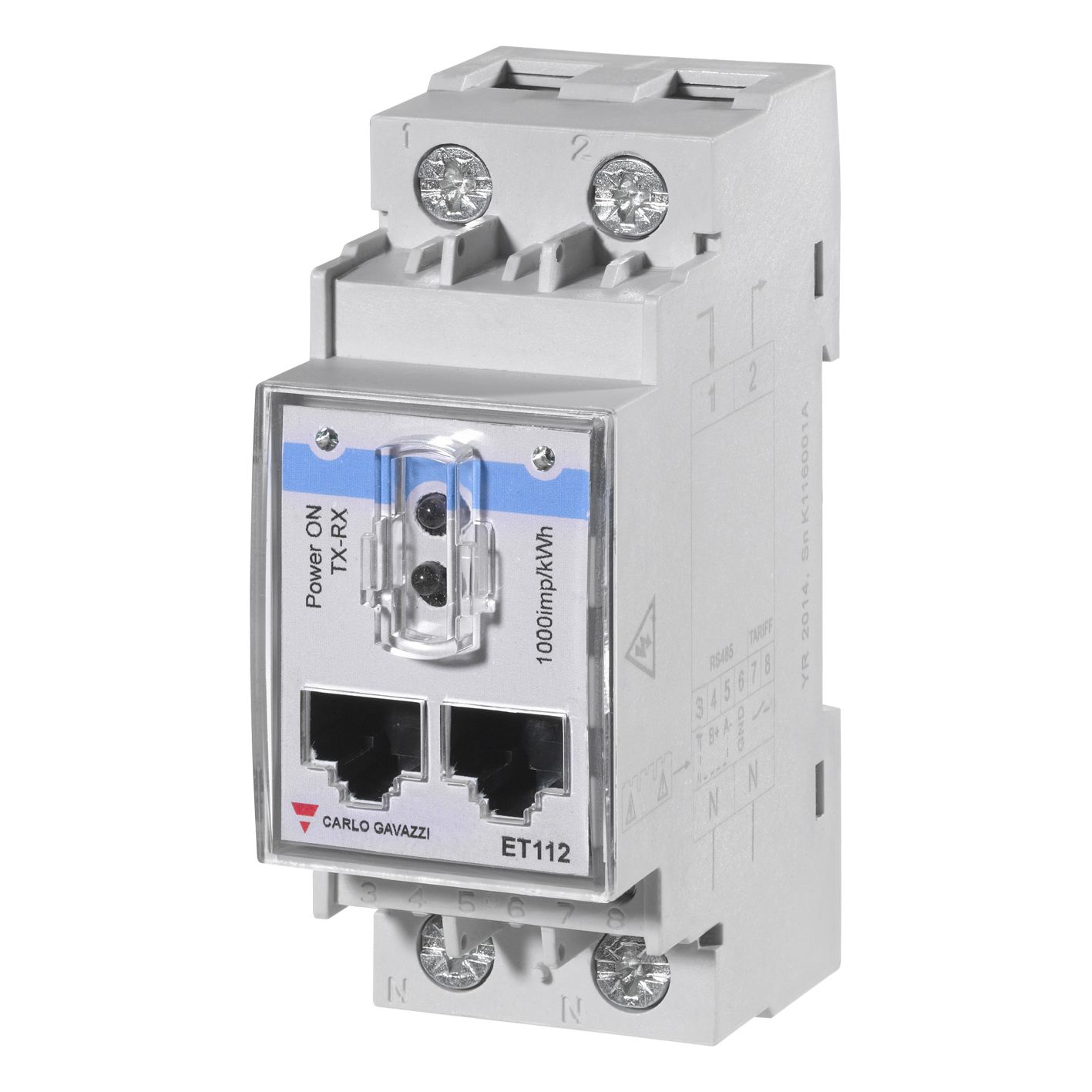 ET112DINAV01XS1X Energimåler. 1-fase energi-/forbruksmåler for direkte måling maks. 100A. Uten display. RS485 Modbus grensesnitt og optisk port. Tilgang til alle relevante måleverdier som strøm, spenning, aktiv effekt, reaktiv effekt, cos. phi, aktiv energi (kWh), reaktiv energi (kVArh) osv. Velegnet for systemer med behov for måling av mange laster. Modulærutførelse med byggebredde 2-moduler. Energi transduser.
