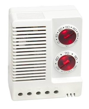 Elektronisk hygrostat/termostat. Fuktområde 50-90% RH. Temperaturområde 0-60°C. IP20. DIN-skinne montering. Stego.
