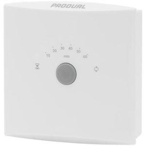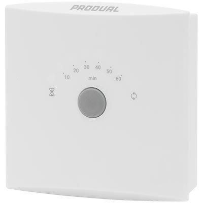 Hvit elektronisk tidsbryter for 10-60 minutter. For veggmontasje. Brukes til aktivisering av bla. ventilasjon eller forsering av ventilasjon og lysstyring.