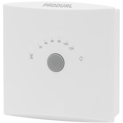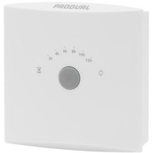 Hvit elektronisk tidsbryter for 2-12 timer. For veggmontasje. Brukes til aktivisering av bla. ventilasjon eller forsering av ventilasjon og lysstyring.