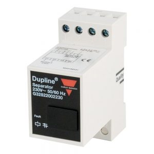 G32822002230 Dupline Feltbuss Separator, Tilbehør, DIN-skinne, 2 moduler, 230VAC forsyningsspenning. Dupline Seperator isolerer en del av Duplinenettet og forhindrer at hele nettet går ned ved kortslutning.