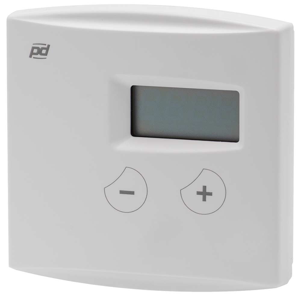 Romkontroller/temperaturregulator med Modbus RTU og CO2-føler. Enheten er har + og – betjeningsknapper og Display, men uten LED-indikator.