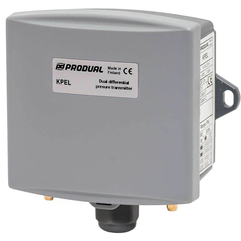 KPEL-M Dobbel differansetrykktransmitter. Dobbel differansetrykktransmitter for luft. Trykkgiver med måleområde 0-2500Pa. Med Modbus. 2 univ. inn- og utganger
