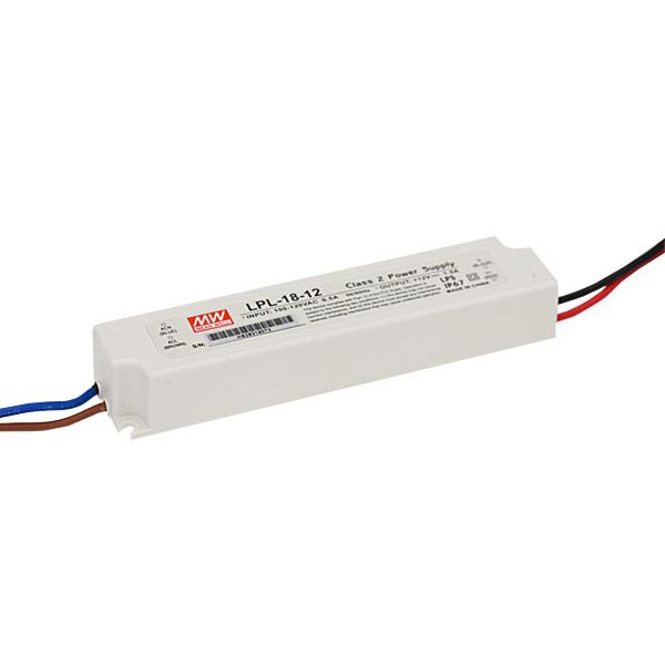 Strømforsyning for LED, 12VDC/18W, kapslet, for panelmontasje, fast kabel.