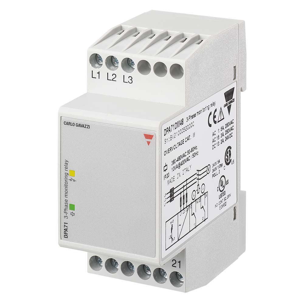 Nettovervåkningsrelè for 3-fase AC med 2 releutganger. Releet overvåker fasefølge/fasebrudd på nominell nettspenning 380-480 VAC. Relèet er selvforsynt, og er i modulærutførelse med byggebredde 2-moduler.