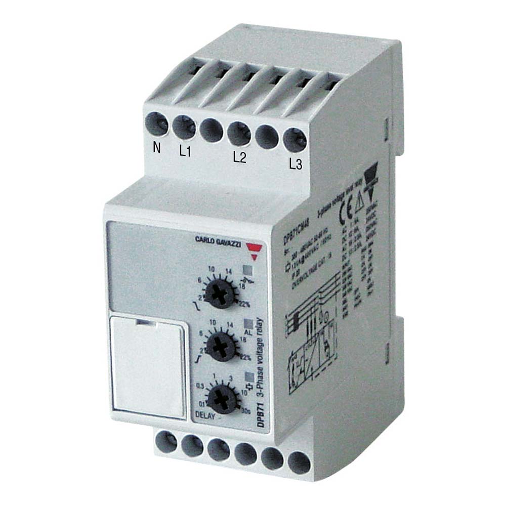 Nettovervåkningsrelè for 3-fase AC med 1 releutgang. Releet overvåker overspenning/underspenning + fasebrudd/fasefølge. For nominell nettspenning 208-240 VAC. Justerbar tidsforsinkelse. Relèet er selvforsynt, og er i modulærutførelse med byggebredde 2-moduler.