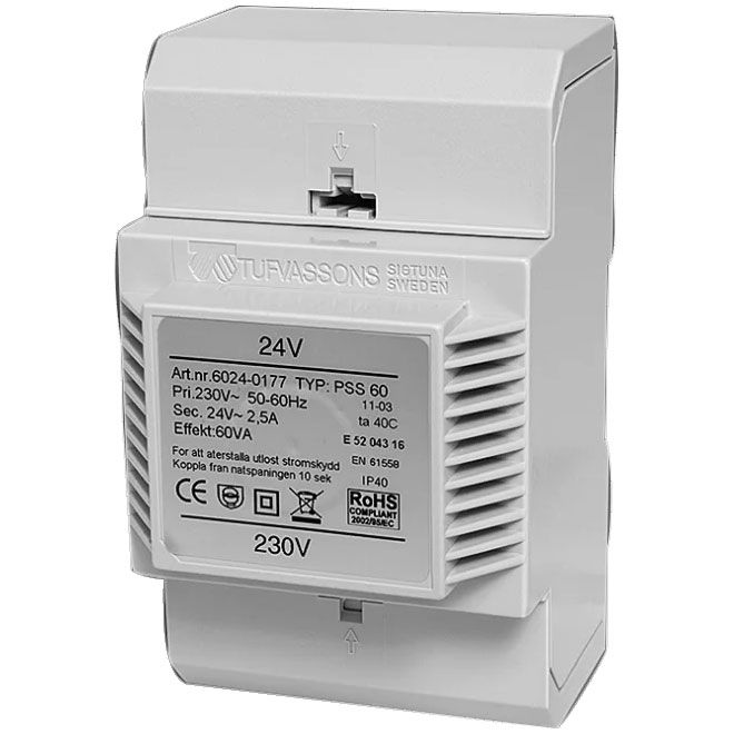 Modulær dobbeltisolert vernetrafo 230VAC/24VAC 60VA. PTC-sikring for beskyttelse mot kortslutning og overbelastning, nullstilles når strømmen kuttes i 10 sek.