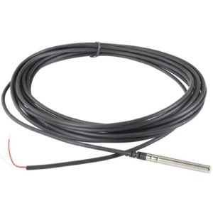 Pt1000 temperaturføler for væske. Hylse i rustfritt syrefast stål Ø = 6mm, l = 100mm. Temperaturområde -40 til +400 °C. Leveres med fast 2-leder stålomflettet kabel med lengde 3m.
