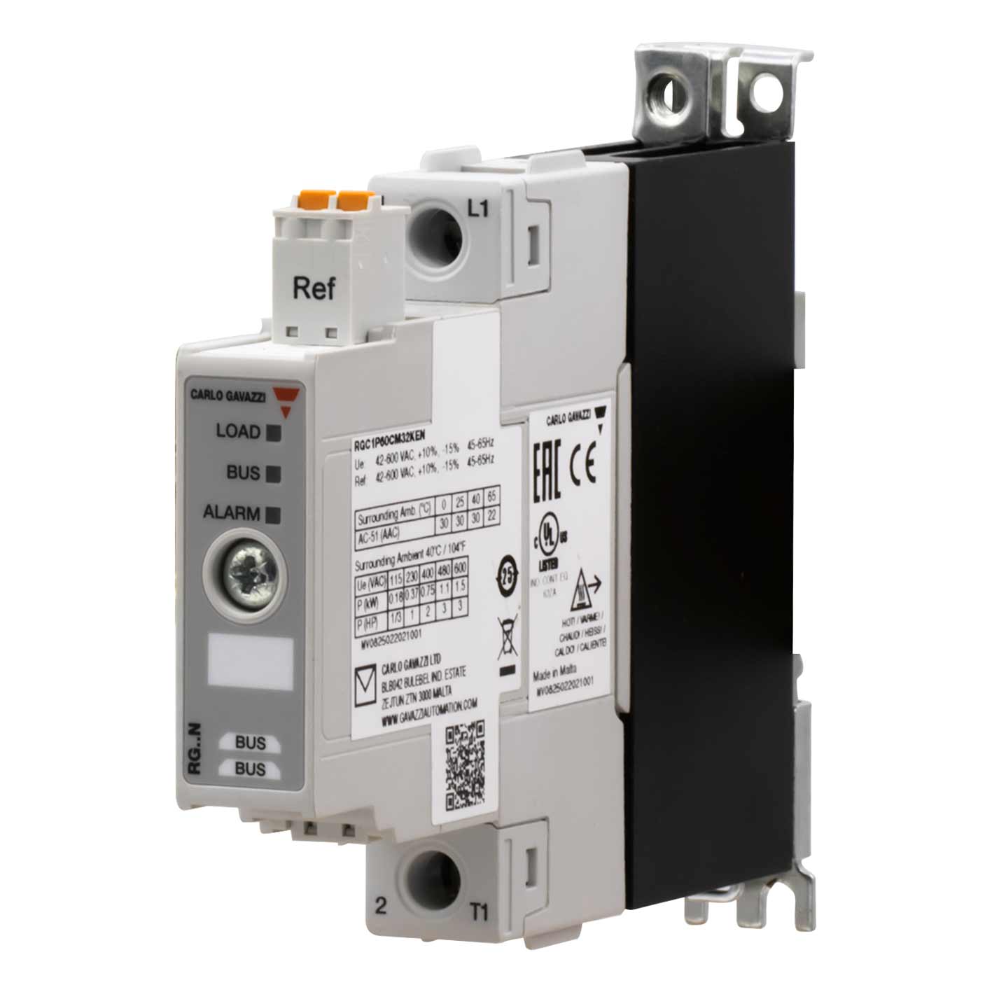 RGC1A60CM32KEN Solid state relè. Solid State kontaktor i NRG-systemutførsel med integrert kjøleribbe, 1-fas styring, primærspenning 42-660VAC, styresignal 4-32VDC eller BUS, maks last 32A, kobling i nullgjennomgang. NB! Fjærklemme plugger for styresignal må bestilles separat type RG3G25