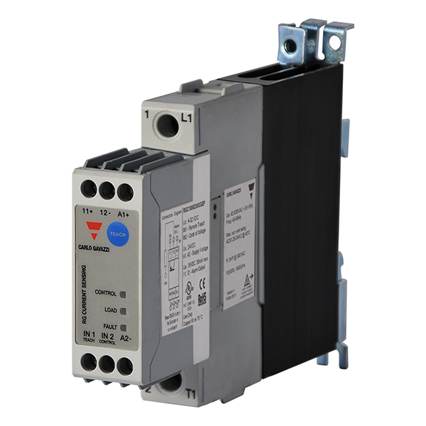 Solid state kontaktor med integrert kjøleribbe, 1-polet, 600VAC/25A, styrespenning 5-32VDC, innebygget strømmålefunksjon, kobling i nullgjennomgang.