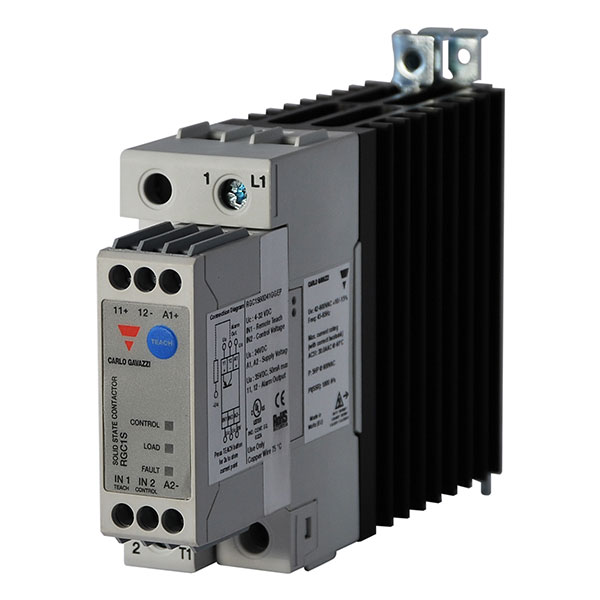 Solid state kontaktor med integrert kjøleribbe, 1-polet, 600VAC/43A, styrespenning 5-32VDC, innebygget strømmålefunksjon, kobling i nullgjennomgang.