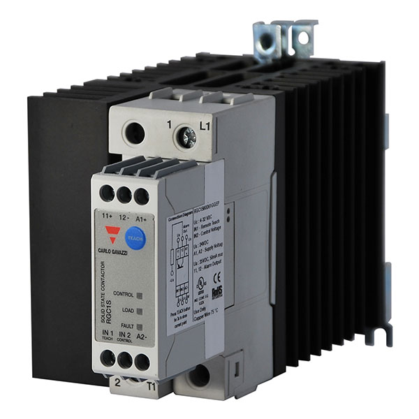 Solid state kontaktor med integrert kjøleribbe. 1-polet. Maks. 600VAC/65A. Styrespenning 5-32VDC. Innebygget strømmålefunksjon. Kobing i nullgjennomgang. *** Om serien: RGC1S-serien leveres for nominell nettspenning inntil 600VAC, og maks last strøm inntil 85A. Kobling i nullgjennomgang. Integrert strømmålefunksjon, som enkelt detekterer om deler av lasten er ute. Relèet leveres med lysdiodeindikering, integrert kjøleplate og snappfeste for direkte DIN-skinne montasje. Byggebredde fra 22,5 mm til 70 mm. Solid state releer kan benyttes i forbindelse med kobling av både ohmske laster som varmeelementer, og induktive laster som motordrifter. Fordelene sammenlignet med bruk av elektromekaniske kontaktorer er blant annet svært lang levetid, mulighet for høy koblingsfrekvens, kobling uten lysbue og lydløs kobling.