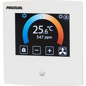 Romføler temperatur , RH%, PIR og CO2 med grafisk touch display. Veggmontering. Hvit. Kommuniserer på Modbus RTU. Benyttes med CU multifunksjonskontroller.