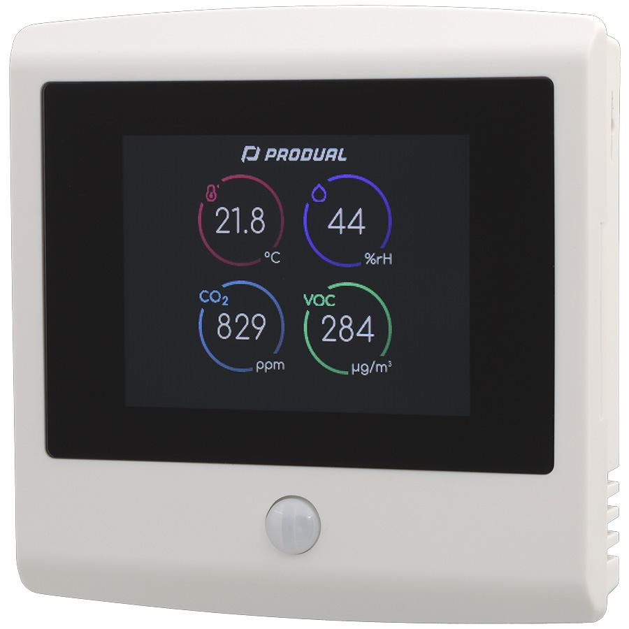 Temperatur CO2, Rh% og VOC transmitter for rom. Hvit utførelse med PIR deteksjon og Bacnet kommunikasjon. Mulighet for Bluethooth kommunikasjon mot MyProdual/MyTool app for programmering.