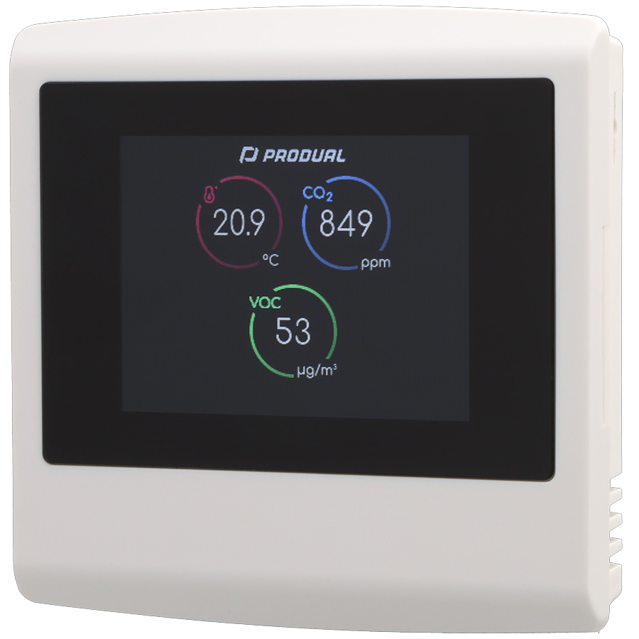 Temperatur, CO2 og VOC transmitter for rom. Hvit utførelse med Bacnet kommunikasjon. Mulighet for Bluethooth kommunikasjon mot MyProdual/MyTool app for programmering.