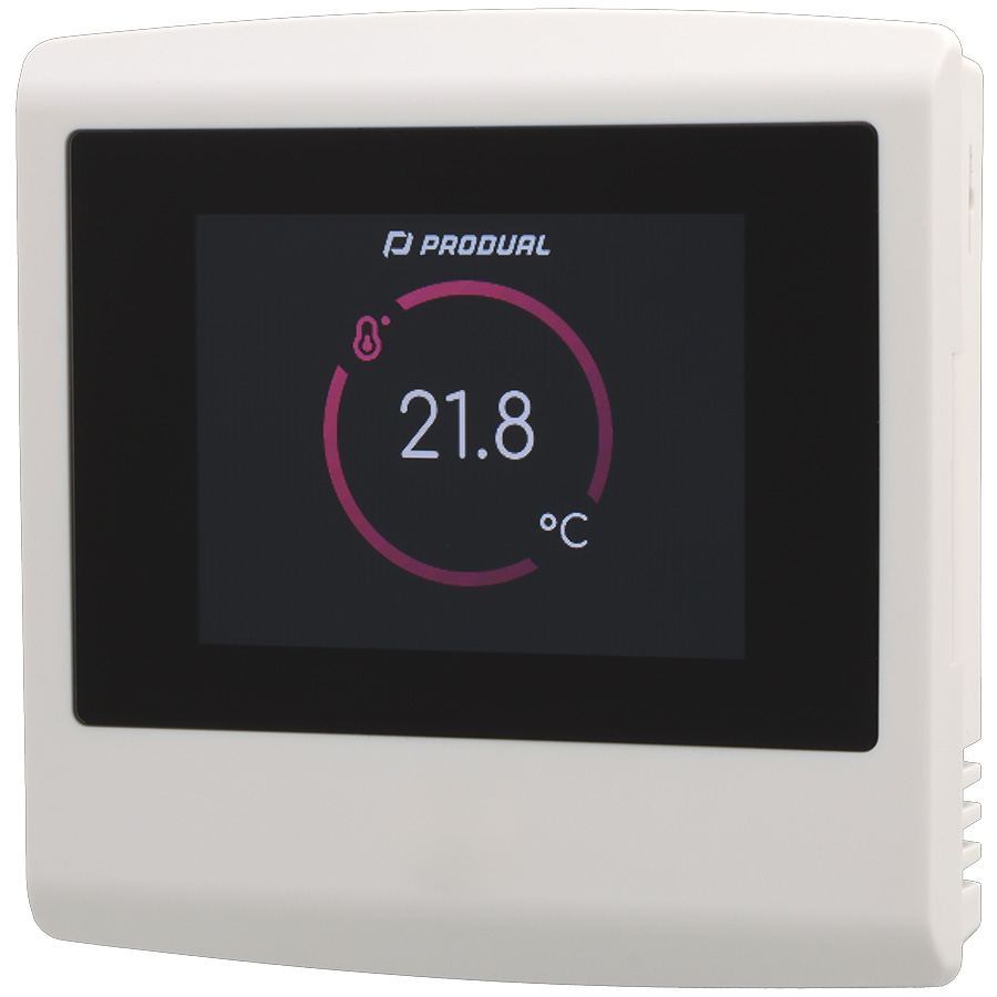 Temperatur, CO2 og Rh% transmitter for rom. Hvit utførelse med Modbus kommunikasjon og rele. Mulighet for Bluethooth mot MyProdual/MyTool app for programmering.