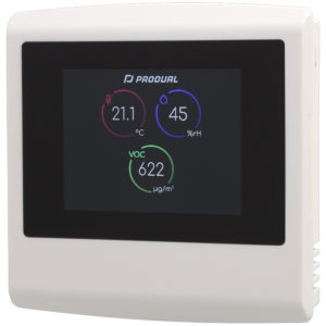 Temperatur Rh% og VOC transmitter for rom. Hvit utførelse med Modbus kommunikasjon. Mulighet for Bluethooth kommunikasjon mot MyProdual/MyTool app for programmering.