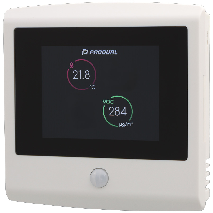 Temperatur og VOC transmitter for rom. Hvit utførelse med PIR og Bacnet. Mulighet for Bluethooth kommunikasjon mot MyProdual/MyTool app for programmering.