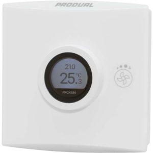 RU1F-D Romkontroller. Romføler for Modbus kommunikasjon med display og ratt for justering av settpunkt. Hvit utførelse med vifteknapp . Måleområde 0…50 °C. Inngår i Produals Proxima-serie av romenheter og romkontrollere som finnes i både trådbundne og trådløsutførelser. Enhetene er basert på Produals PUMP-konsept (Produal Unified and Modular Plattform) som er basert på Plug-n-Play med enkel trådløs oppdatering og konfigurering av produktene. Fabrikat: Produal.
