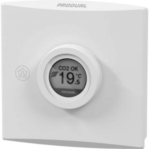 RU1M-D-RH-CO2 Romkontroller. Romføler for Modbus kommunikasjon med tilstedeværelseknappknapp, display og ratt for justering av settpunkt. Hvit utførelse. Måleområde 0…50 °C, 0…2000 ppm og 0…100 Rh%. Inngår i Produals Proxima-serie av romenheter og romkontrollere som finnes i både trådbundne og trådløse utførelser. Enhetene er basert på Produals PUMP-konsept (Produal Unified and Modular Plattform). Dette er et Plug-n-Play konsept med enkel trådløs oppdatering og konfigurering av produktene.