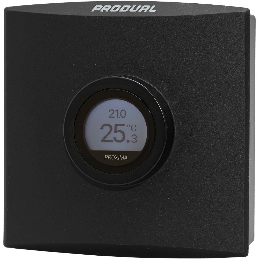 RUB-D-RH Romkontroller. Romføler for Modbus kommunikasjon med display og ratt for justering av settpunkt. Sort utførelse. Måleområde 0…50 °C og 0…100 Rh%. Inngår i Produals Proxima-serie av romenheter og romkontrollere som finnes i både trådbundne og trådløse utførelser. Enhetene er basert på Produals PUMP-konsept (Produal Unified and Modular Plattform). Dette er et Plug-n-Play konsept med enkel trådløs oppdatering og konfigurering av produktene.
