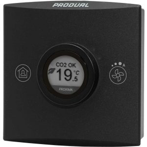 RUB2FM-D-RH-CO2 Romkontroller. Romføler for Modbus kommunikasjon med tilstedeværelseknapp, vifteknapp, display og ratt for justering av settpunkt. Sort utførelse. Måleområde 0…50 °C, 0…2000 ppm og 0…100 Rh%. Inngår i Produals Proxima-serie av romenheter og romkontrollere som finnes i både trådbundne og trådløse utførelser. Enhetene er basert på Produals PUMP-konsept (Produal Unified and Modular Plattform). Dette er et Plug-n-Play konsept med enkel trådløs oppdatering og konfigurering av produktene.