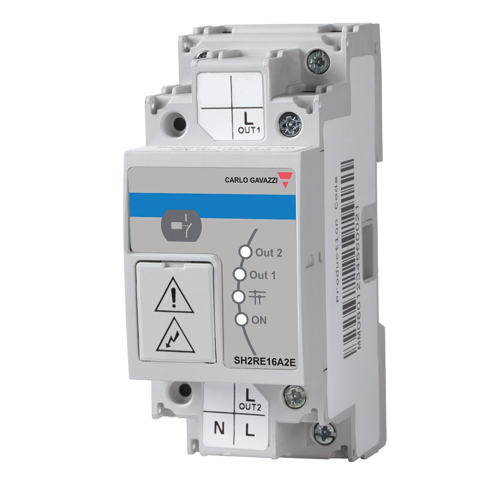 SH2RE16A2E230 er et rele som monteres på DIN-skinne. Byggebredde 2 moduler. Det har 2 stk 16A utganger, og forsynes fra 230VAC. Relèet har integrert energiavlesning som registrerer bl.a. Kwh, Kw, V, A, Hz på utgangene.