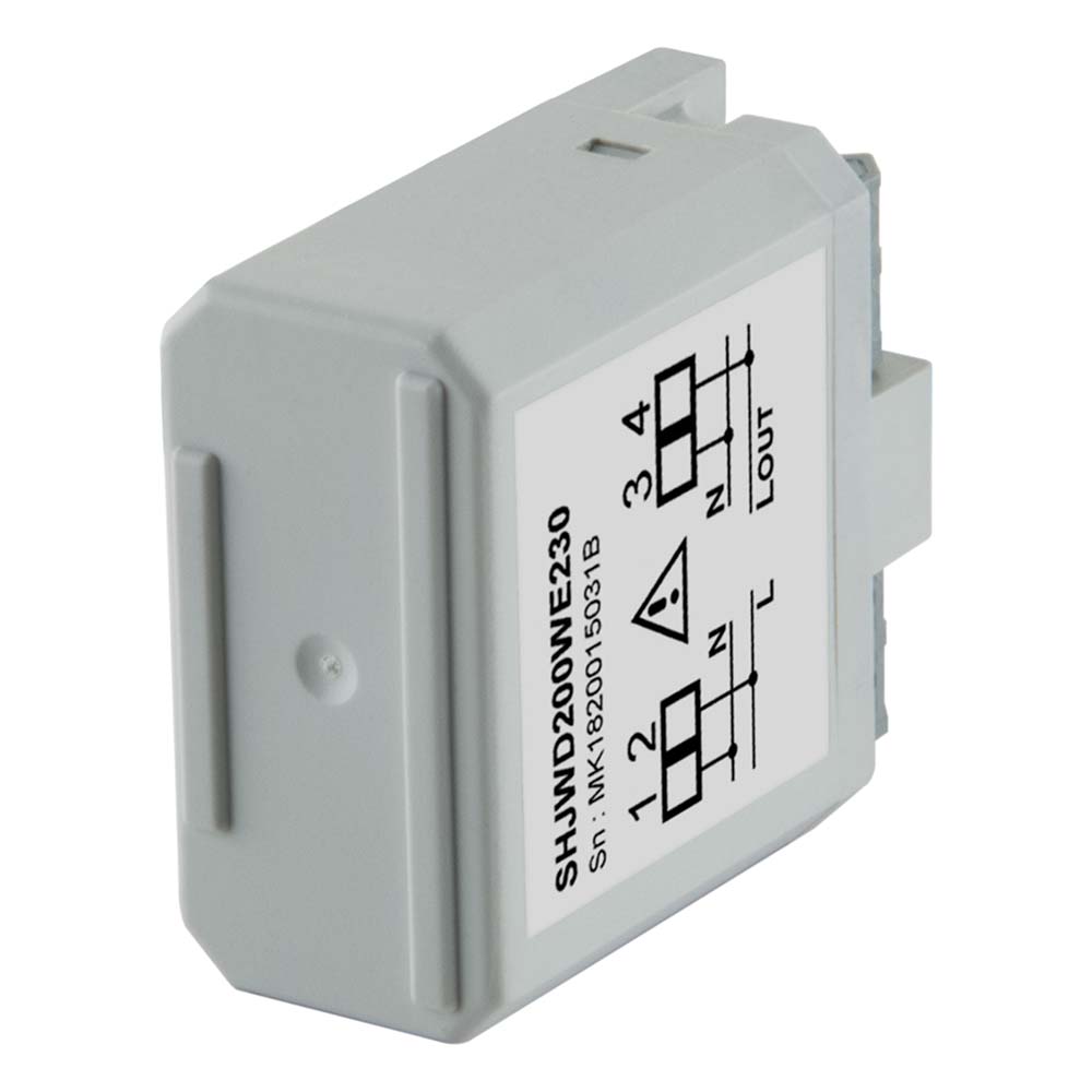 SHJWD200WE230 er en trådløs universal dimmer på 200W. Den kommuniserer med SH2WBUA230 trådløs bastestasjon. Dimmeren har integrert energiavlesning på utgangen og kan styre alle laster, R-L-C og LED.. Monteres direkte i veggboks eller lampepunkt. Montering: Desentralisert. Forsyning: 230VAC