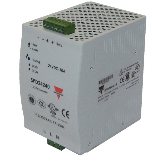 Alternativer finnes i SPMA og SPDE-seriene. Strømforsyning for 1-fas 90-264 VAC forsyningsspenning. Sekundærspenning 24 VDC. Effekt inntil 240 W. For DIN-skinne montasje. Skrutilkobling. Ikke-modulær utførelse.